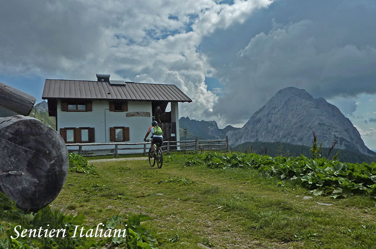 | .... a Casera Chiastelin, dove sale, da destra, una stretta via sterrata (possibile abbreviare il percorso seguendo quest'ultima che scende più velocemente in Val Visdende). Davanti alla casera vi è un'area di sosta e, a sinistra della casa, passa il sentiero segnalato da seguire per Casera Antola. |