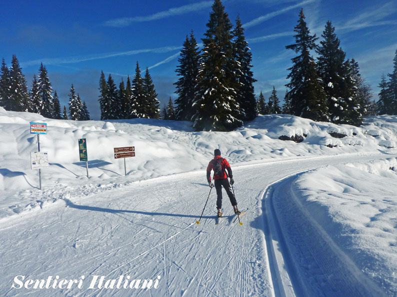 pista da fondo per Marcesina, dove si prosegue a sinistra sulla Pista da fondo Moline (segnavia rosso). Poco dopo la salita termina ... |